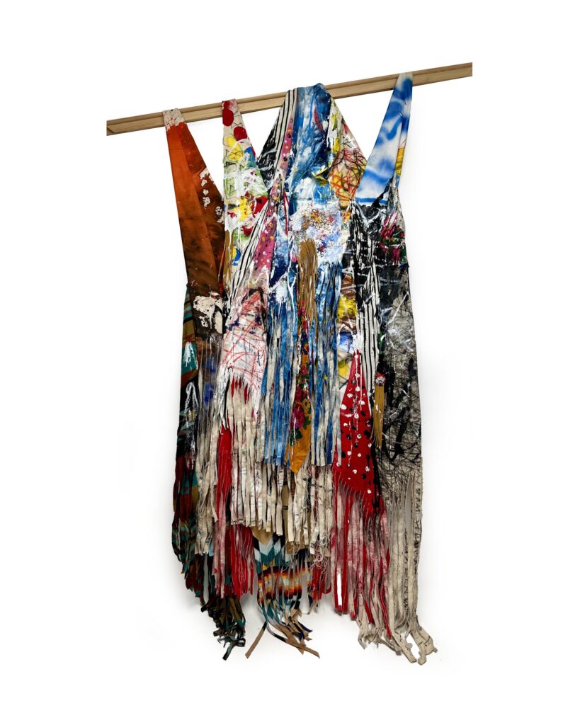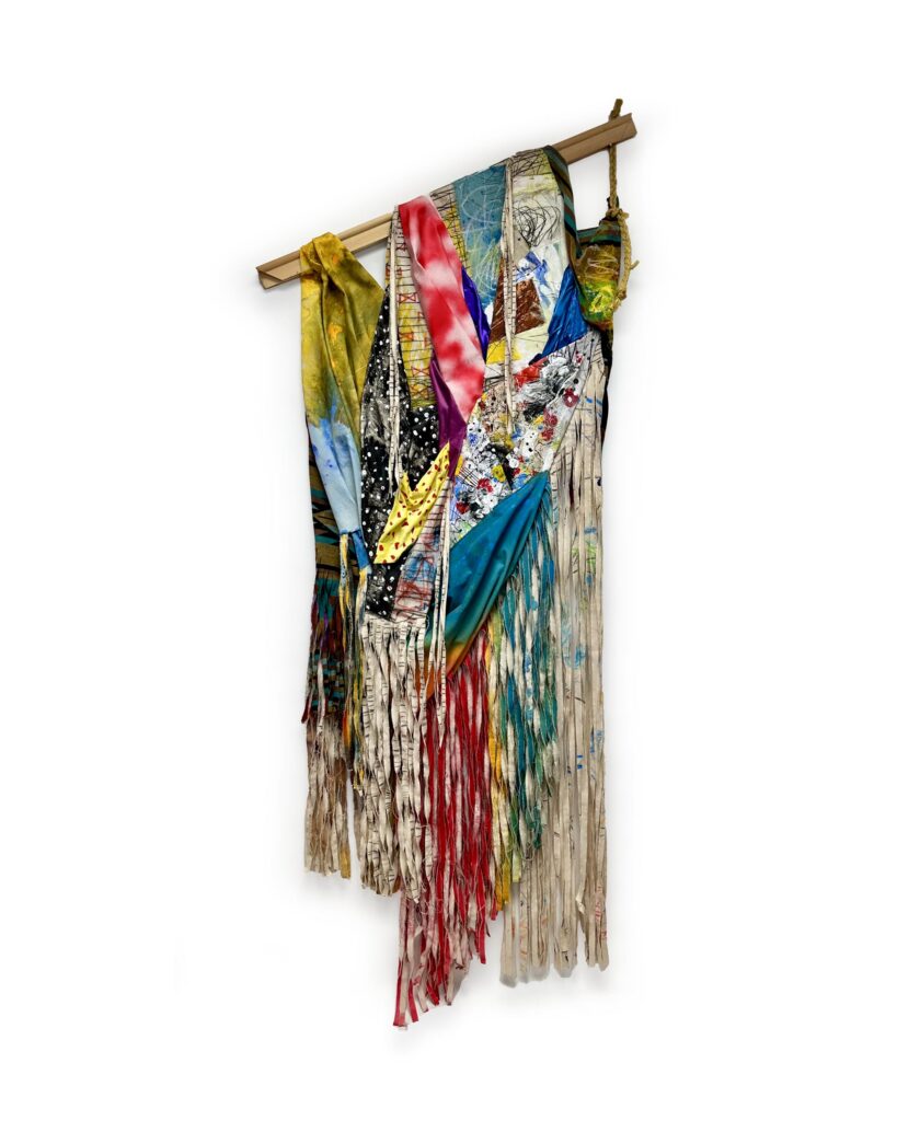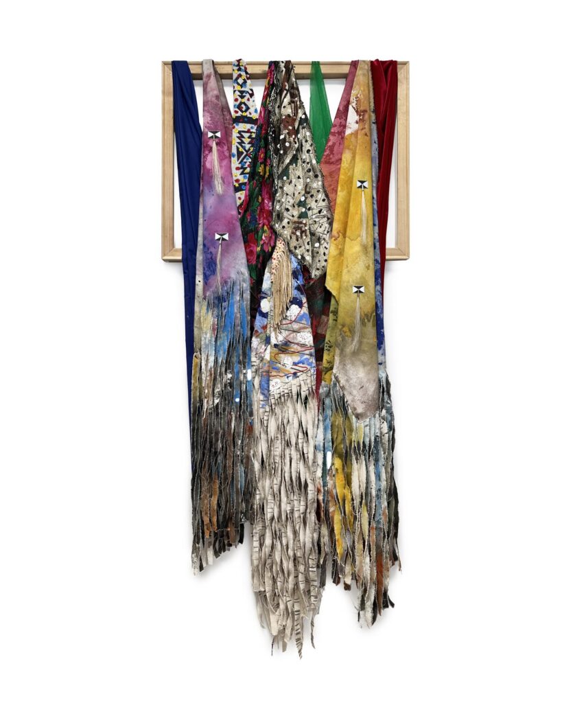 Oil, acrylic, enamel, acrylic dispersion, cotton fabric, mass manufactured synthetic textile, seed beads, scarf, tanned deer hide, oil stick, oil pastel, charcoal, staples, sewing on canvas, and wood stretcher bar