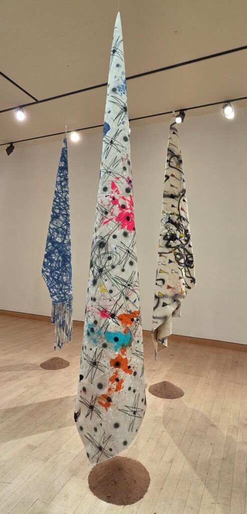 Oil, acrylic, enamel, oil stick, oil pastel, charcoal, pen and ink, marker, sharpie, spray paint, paper, tarp, synthetic textile, seed beads, natural earth pigment, synthetic polymer, acrylic dispersion, canvas, sand (natural earth collected near To’ Dil Doo’, Navajo, NM, Navajo Nation)